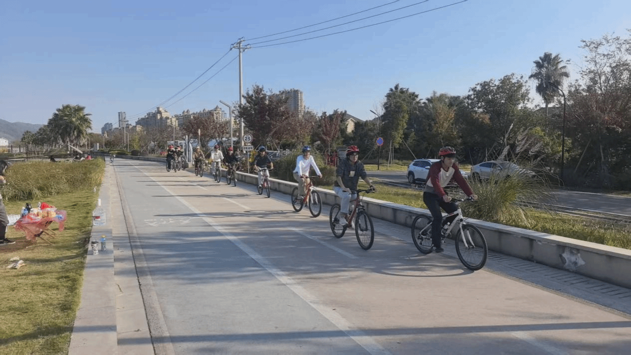 见习第二站,温州市自行车发展协会骑行俱乐部提供专业指导。学生们接受骑行安全教育与技能学习后,环七都岛骑行,实地考察“环浙步道”建设成果。结合七都岛的休闲体育规划,老师们为同学们讲解了休闲体育空间的打造逻辑,以及骑行运动在全民健身、休闲文旅中的价值。一个多小时的骑行,不仅锻炼了同学们的体能,更让大家对休闲体育的场景化应用有了直观认知。