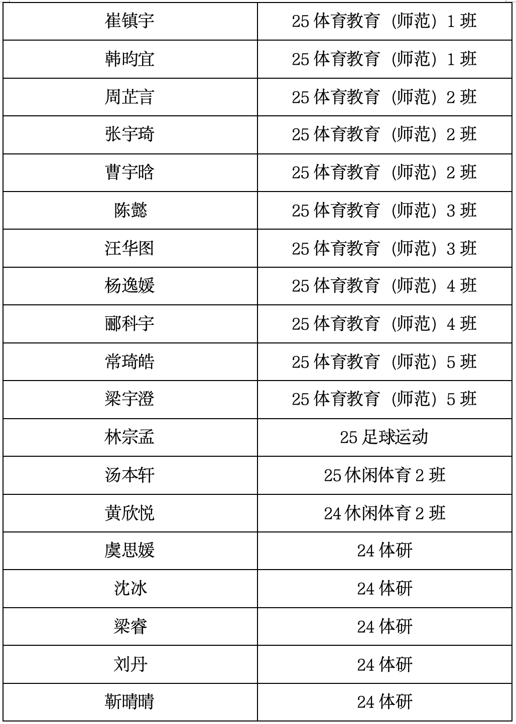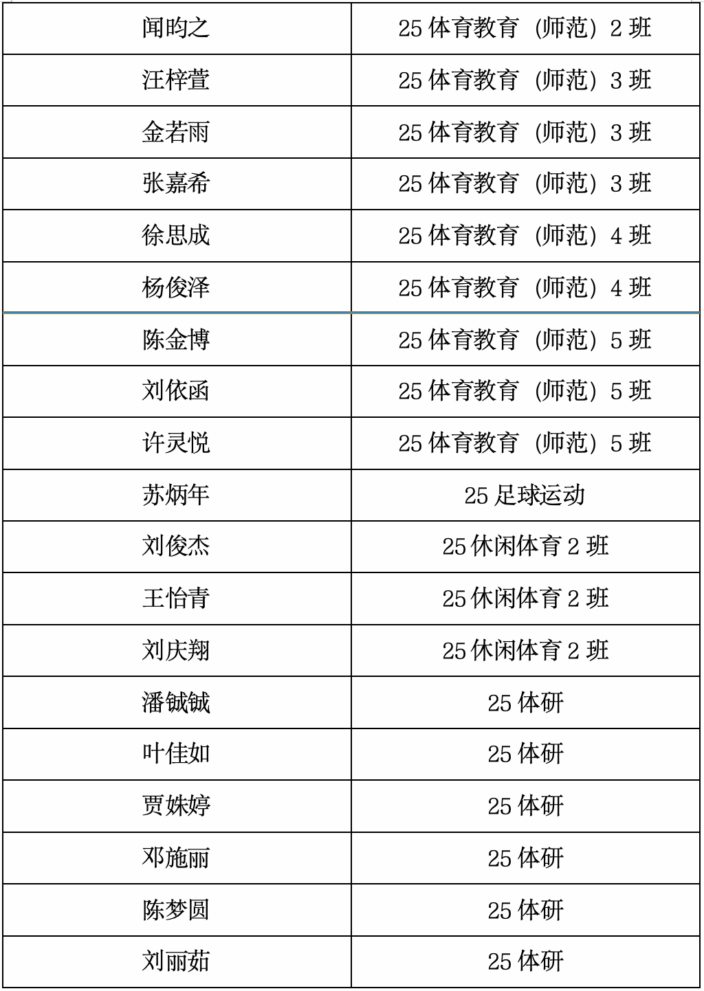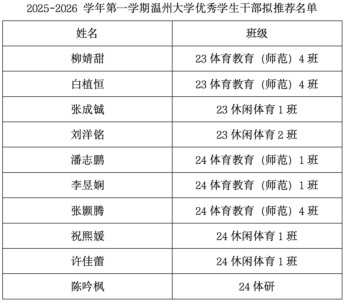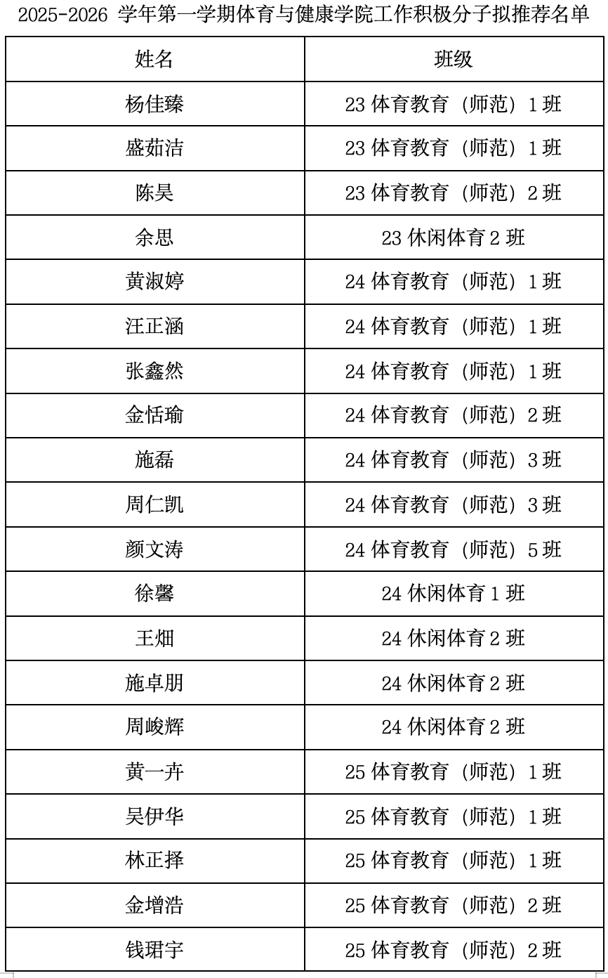 根据《关于评选2025-2026学年第一学期优秀学生干部和工作积极分子的通知》精神,坚持公开、公正、公平的原则,经过组织个人申报、资格初审、学院团委及学生代表评审、候选人汇报以及无记名投票通过:23级体育教育(师范)专业柳婧甜等10人(名单附后)符合“2025-2026学年第一学期温州大学优秀学生干部”拟推荐资格、23级体育教育(师范)专业林特立等39人(名单附后)符合“2025-2026学年第一学期体育与健康学院优秀学生干部”拟推荐资格。23级体育教育(师范)专业杨佳臻等38人(名单附后)符合“2025-2026学年第一学期体育与健康学院工作积极分子”拟推荐资格。