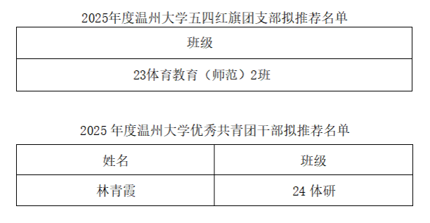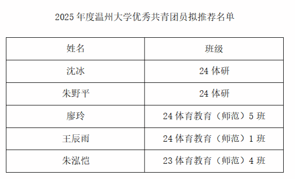 根据《关于开展 2025 年度温州大学"五四红旗团委(团支部)"评选暨团支部风采展示大赛和"优秀共青团干部","优秀共青团员"评选工作的通知》精神, 坚持公开、公正、公平的原则,经过组织个人申报、资格初审、学院团委及学生代表评审、候选人汇报以及无记名投票通过:23体本2班团支部符合2025年度“温州大学五四红旗团支部”拟推荐资格;24体研林青霞(名单附后)符合“2025年度温州大学优秀共青团干部”拟推荐资格、24体研沈冰等5人(名单附后)符合“2025年度温州大学优秀共青团员”拟推荐资格。